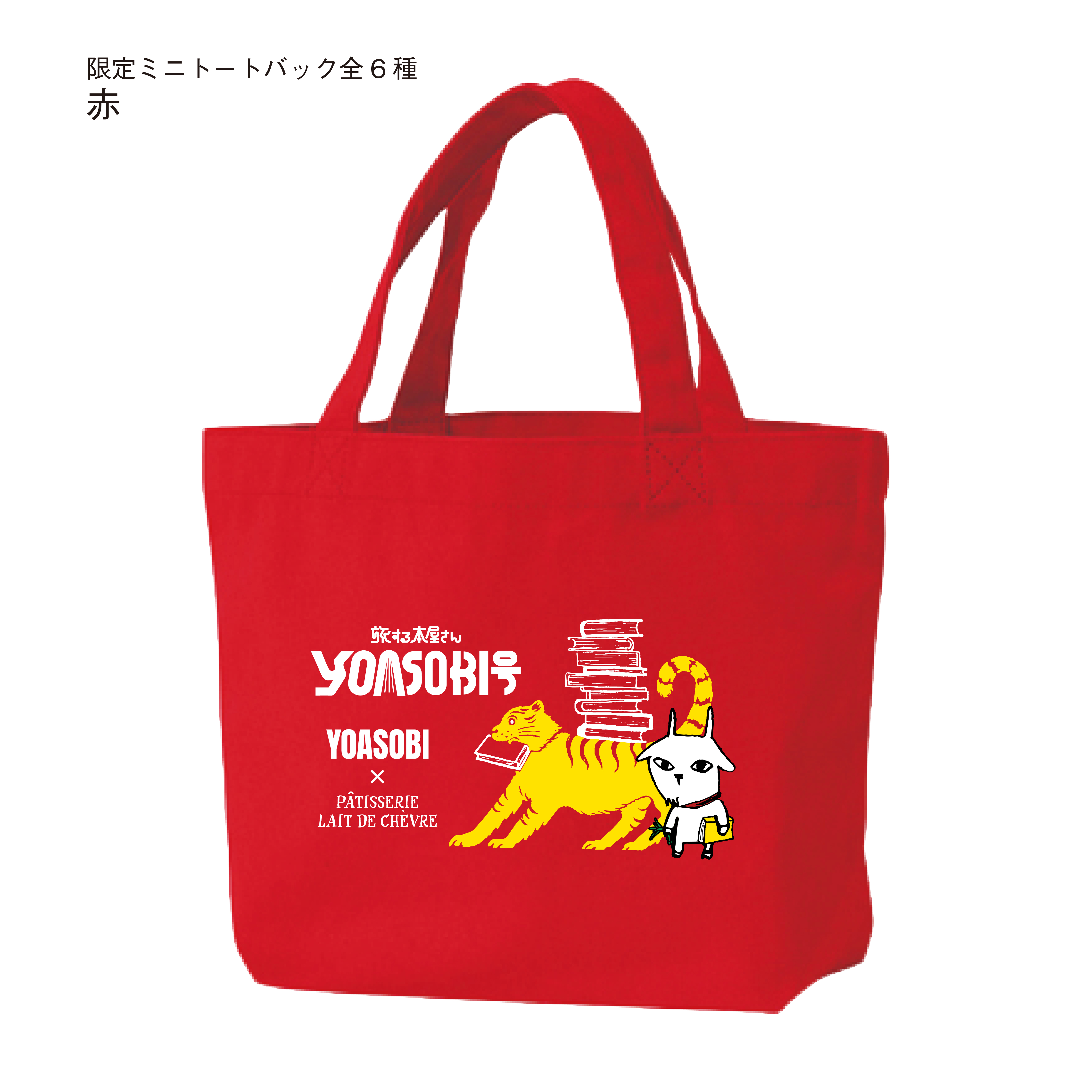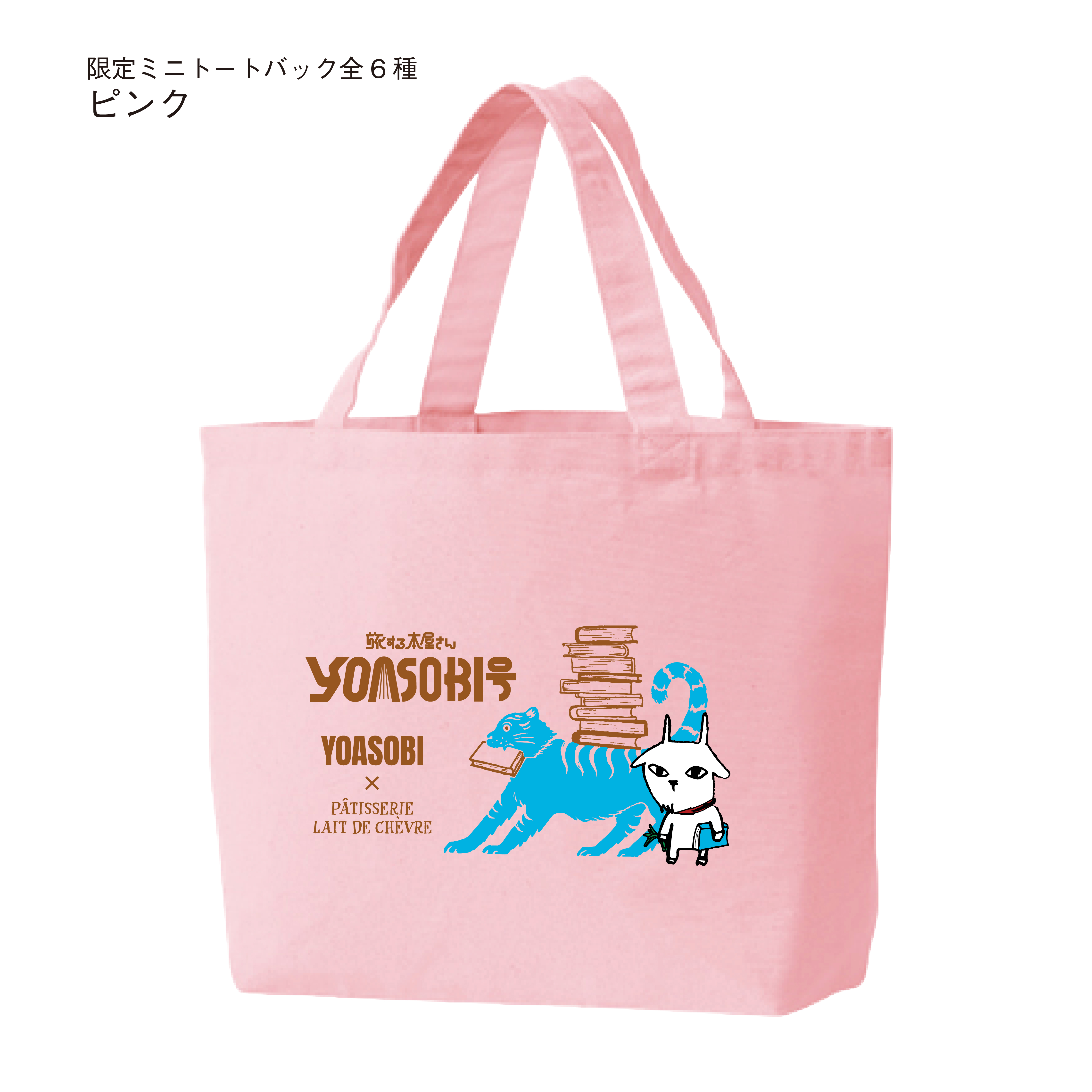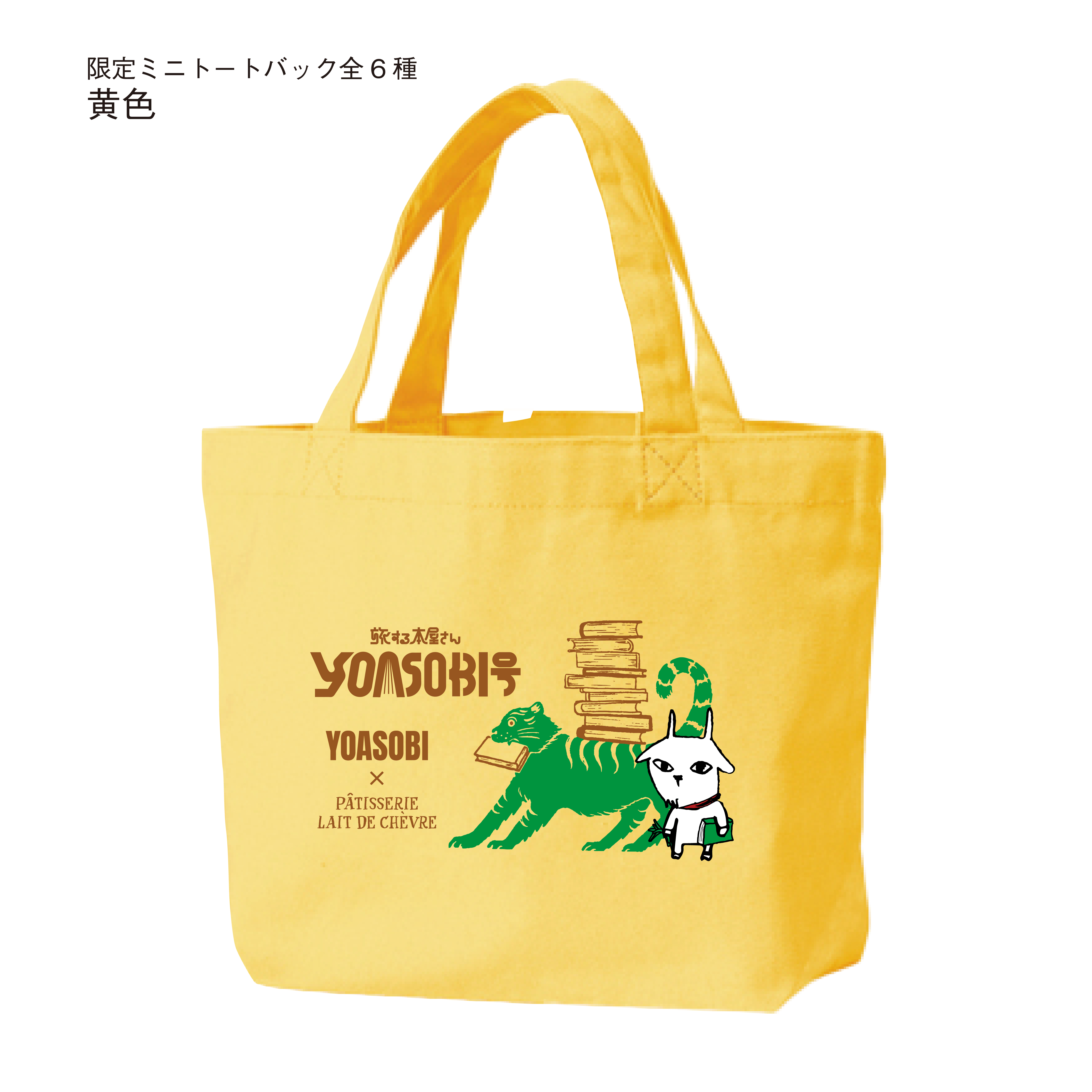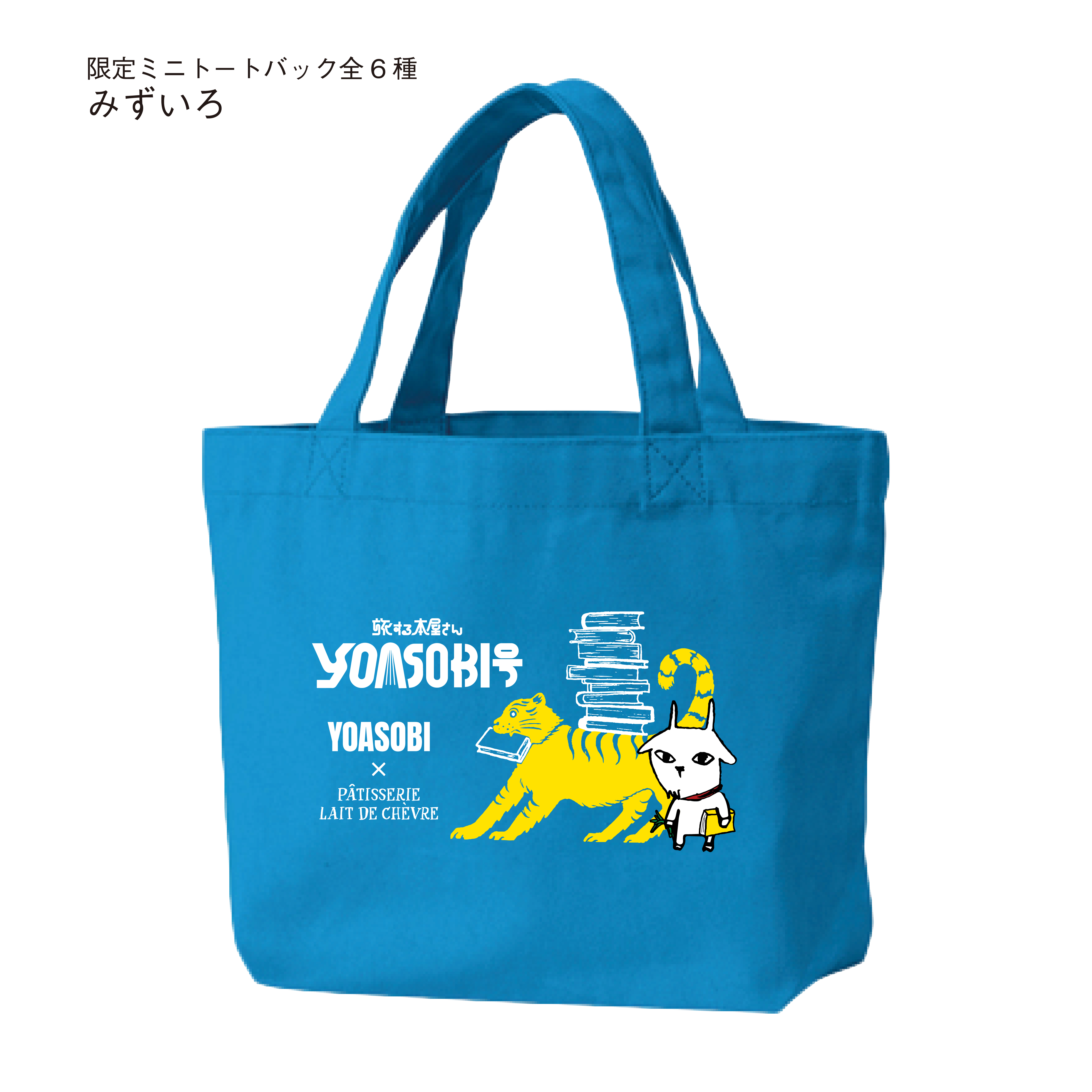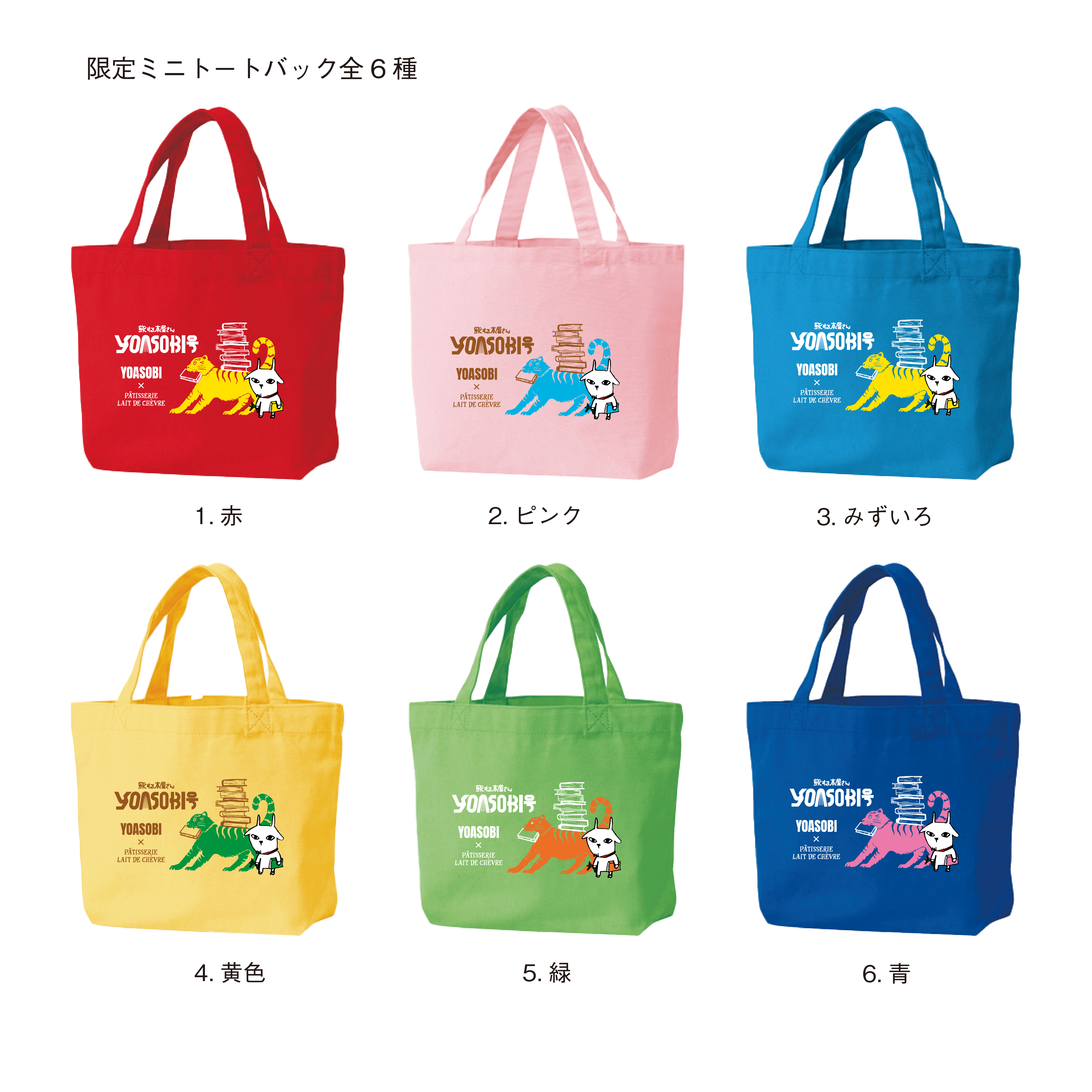 販売期間本日終了のため、本日のみのとってもお得な限定企画です。YOASOBI岩手公演コラボ商品のミニトート6色の中からお好きな3色と、さらに、YOASOBIコラボ商品のステッカー(350円)の全6色をお付けします。